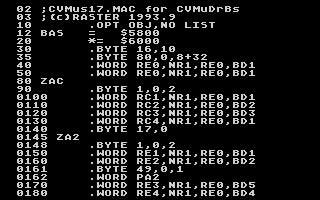 ![]() Hodně lidí se mě ptalo, v jakém hudebním editoru jsem skládal hudbu. Na mou odpověď, že přímo v Assembleru, se koukali poněkud nevěřícně. Takže tady vidíte kus zdrojového kódu hudby číslo 17. Jedná se vlastně o data, která byla přehrávána prostřednictvím mé hudební rutiny CVMSYS2. |